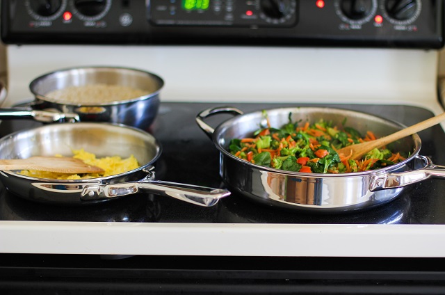 …my new Wolf Gourmet stainless steel cookware. HAVE.YOU.SEEN.IT? The kind folks at Wolf Gourmet sent me their 10-Piece Cookware Set, and you’uns…it is fab. For this particular recipe, I used the 2-quart saucier to steam the rice, the 3-quart saucepan to saute the veggies + fry the rice, and the 8.5-inch skillet to scramble the eggs to add into said fried rice. The line is so flipping gorgeous, I can barely stand it…the cookware is thick, durable, easy to clean, contains super pimp handles, and it’s just so pleasing on the eye sockets. You can purchase the set from Bloomingdales.